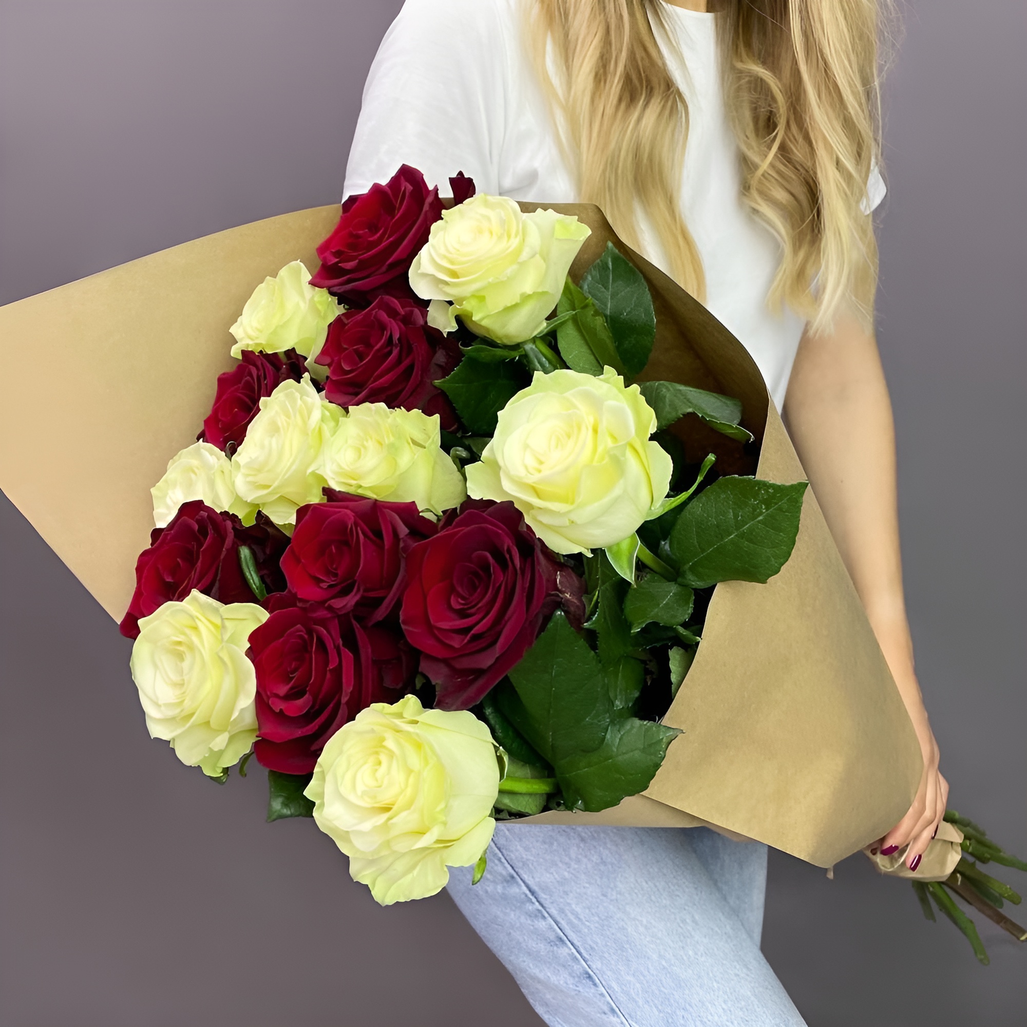 Уникальная композиция из красных и белых роз — воплощение гармонии противоположностей. Идеальный выбор для влюбленных, юбилеев или особых признаний. Купить букет роз Феодосия.