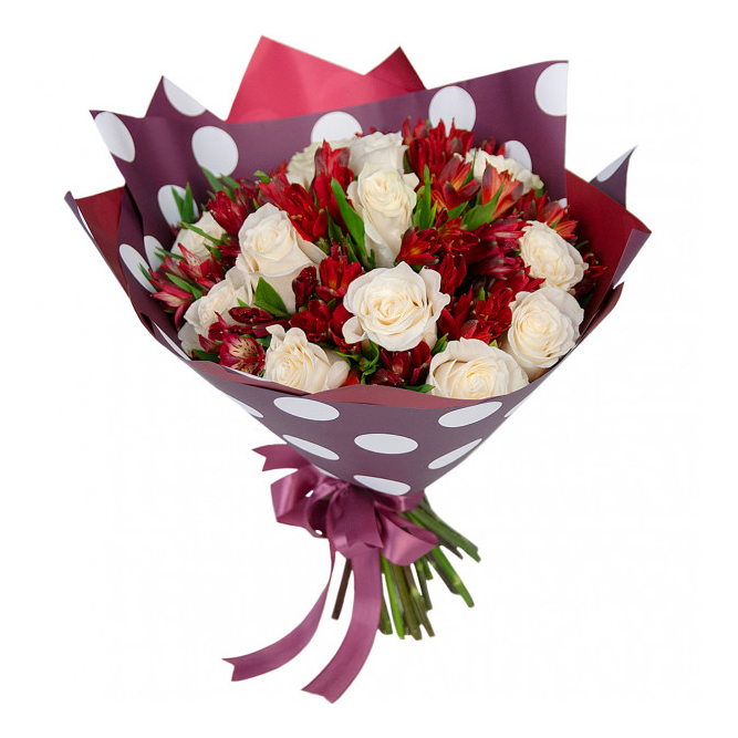 Контрастный букет сочетает нежные белые розы и яркие красные альстромерии. Идеальный подарок для выражения искренних чувств. Букет с доставкой на дом в Феодосии.