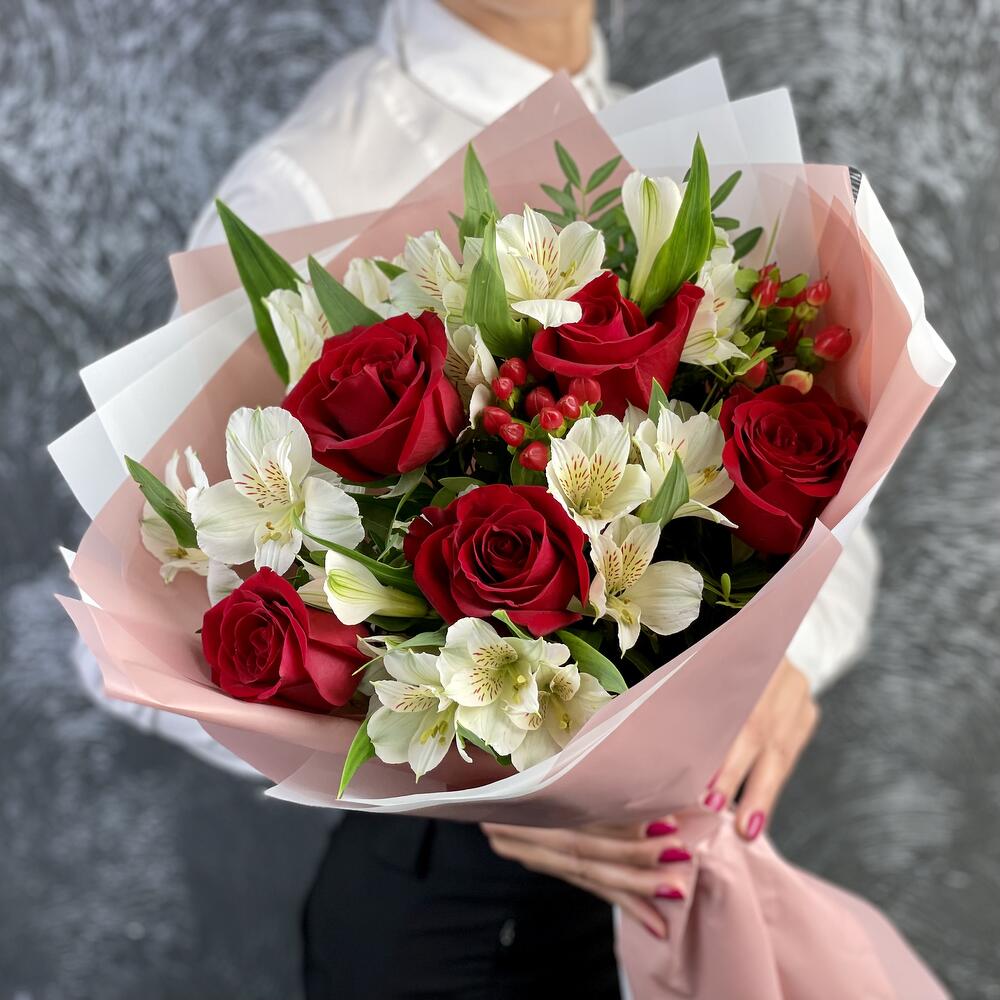 Элегантная композиция из 5 красных эквадорских роз и 4 белых альстромерий с добавлением фисташковой зелени и гиперикума. Изысканный подарок для особых моментов. Заказ цветов с доставкой на дом Феодосия.