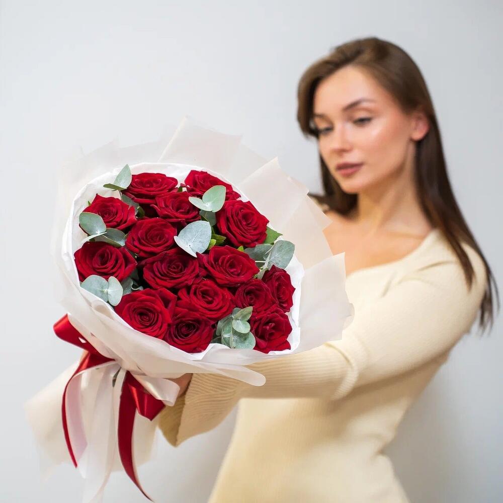 Элегантный букет из 15 красных роз с эвкалиптом – символ страсти и нежности
