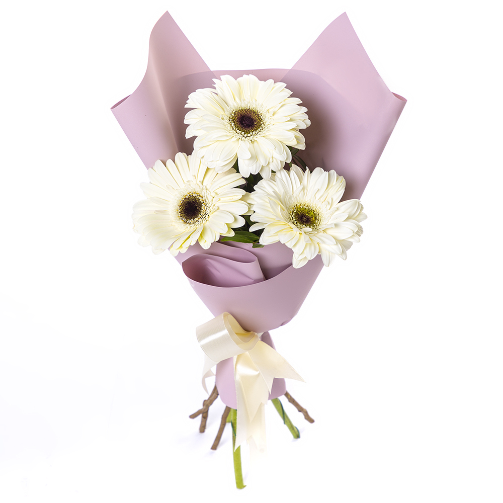 –Нежный букет из 3 белых гербер – символ искренности и света