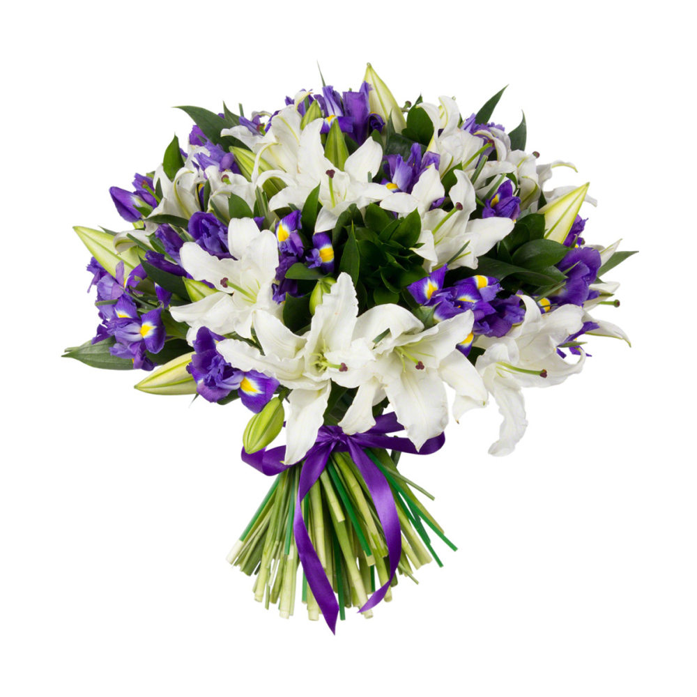 Букет Большой из белых лилий и голубых ирисов – гармония нежности и легкости