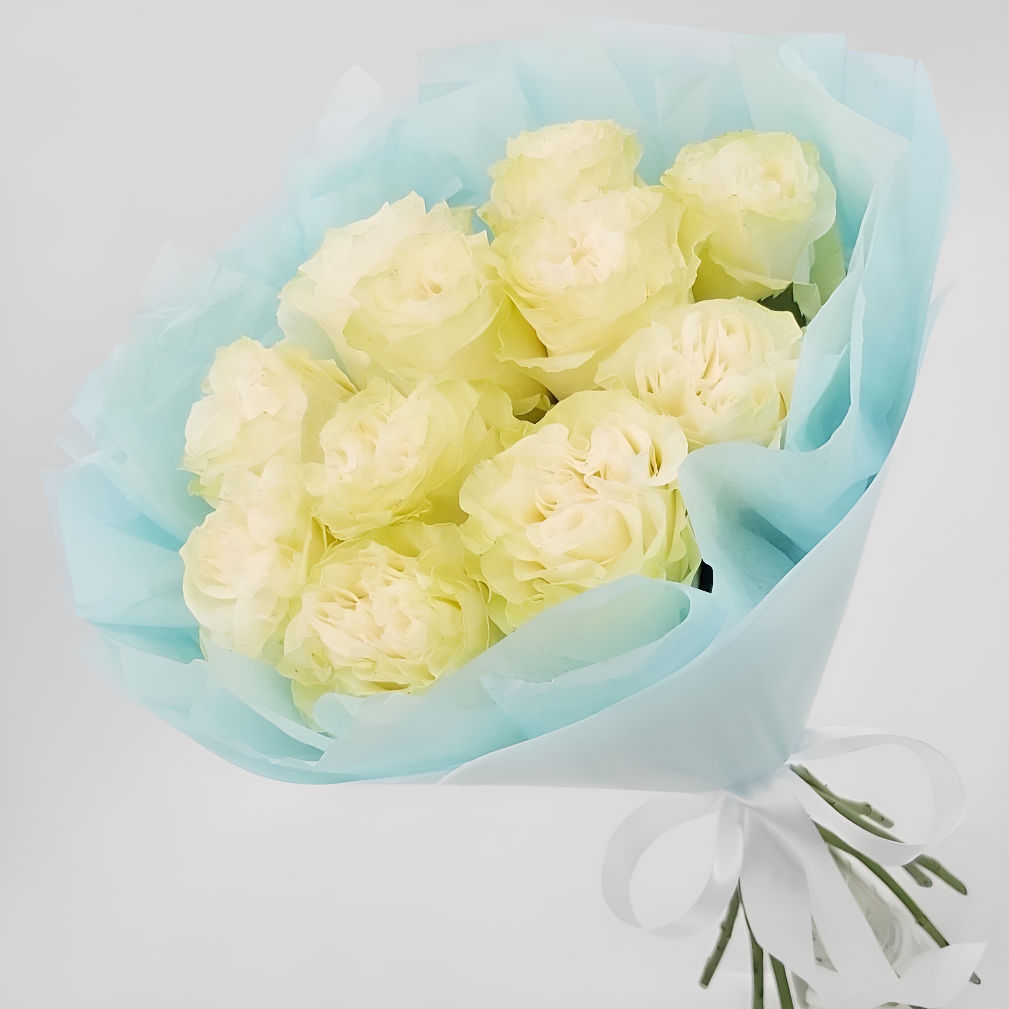 Воздушная композиция из 11 белоснежных эквадорских роз в обрамлении матовой плёнки и нежного тишью. Символ чистоты и невинности. Идеальный выбор для свадьбы, крещения или романтического признания. Заказать цветы с доставкой на дом Феодосия.